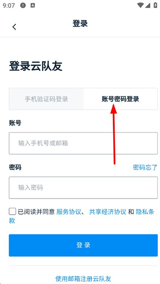 3、登錄界面可切換至賬號密碼登錄,輸入手機號或郵箱、密碼,勾選協議后登錄,若忘記密碼可點擊密碼忘了進行找回。