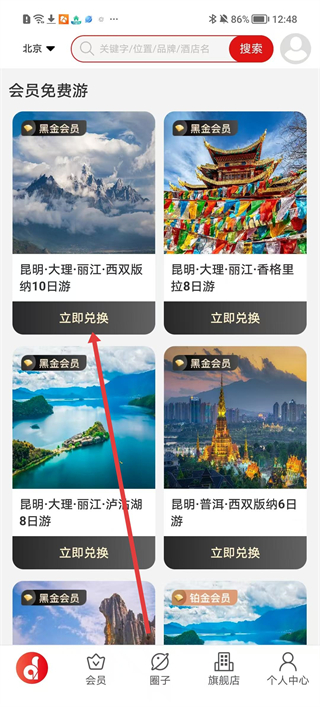1、進入APP首頁,瀏覽會員免費游板塊選擇昆明大理麗江西雙版納10日游,點擊立即兌換,參與會員旅游兌換活動。