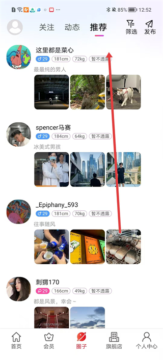 4、在圈子推薦頁面查看這里都是菜心等用戶的動態,了解他人生活分享,也可發布自己的動態,參與社交互動。