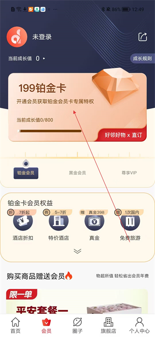 2、進入會員頁面查看199鉑金卡會員權益,了解酒店折扣、免費旅游等特權,可選擇開通會員享受專屬服務。