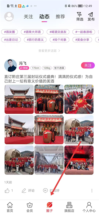 3、點擊圈子選項進入圈子動態頁面,瀏覽馮飛等用戶發布的直訂黔莊封壇儀式等動態,可點贊、評論或打招呼互動。