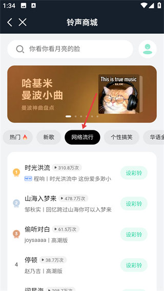 3、網絡流行頁,切換分類后顯示網絡熱門音頻,資源播放量較高,同樣支持設為彩鈴。