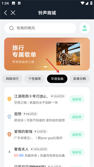 4、華語金曲頁,分類下有經典華語音樂資源,部分為熱門新上線內容,可直接設置成彩鈴。