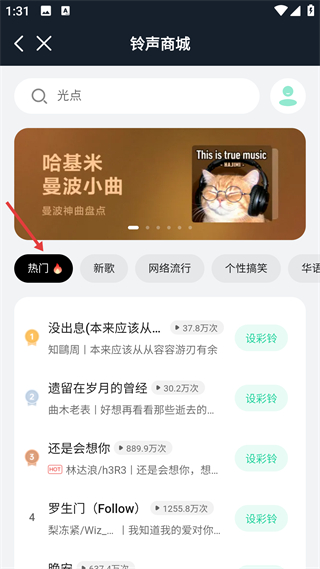 2、鈴聲商城熱門頁,搜索欄可查鈴聲,展示熱門音頻列表,每條資源旁有設彩鈴按鈕,方便快速設置。