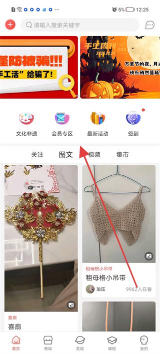 1、進入軟件首頁瀏覽文化非遺、會員專區等功能入口,查看圖文板塊的喜扇、祖母格小吊帶等手工作品,了解手工創作內容,確定興趣方向。