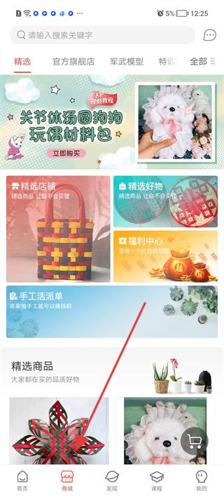 2、點擊商城進入精選頁面,查看關節體湯圓狗狗玩偶材料包等手工商品,瀏覽精選店鋪與精選好物,挑選喜歡的手工材料或成品,準備購買。