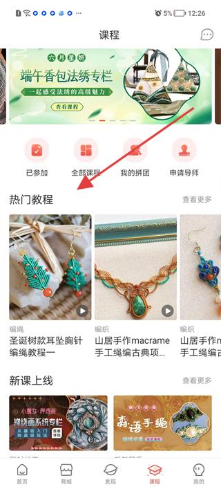 4、進入課程頁面查看熱門教程板塊的圣誕樹款耳墜胸針、山居手作macrame手工繩編等教程,了解課程內容與上線情況,選擇感興趣的課程學習,提升手工技能。
