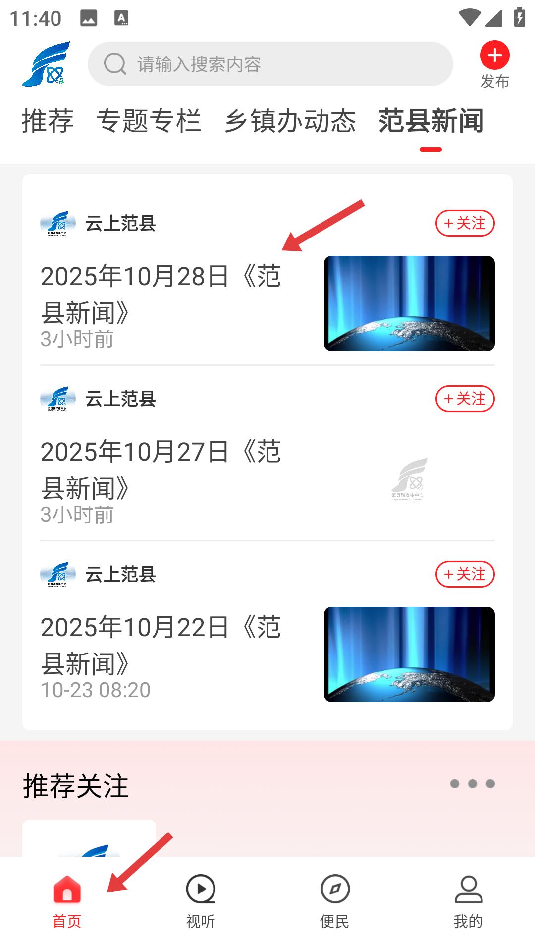 1、在首頁可切換推薦,專題專欄等板塊,瀏覽范縣新聞內容,選擇感興趣的新聞條目進入播放頁面。