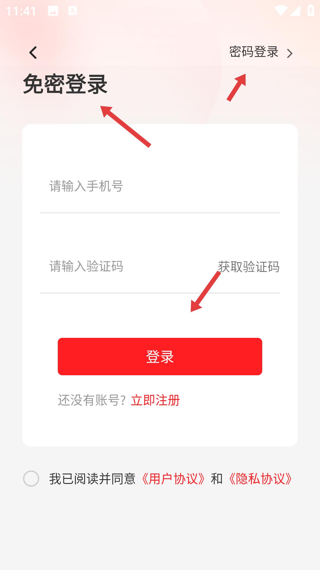 4、在登錄頁面,可選擇免密登錄或密碼登錄方式,輸入手機號和驗證碼,點擊登錄按鈕完成登錄。
