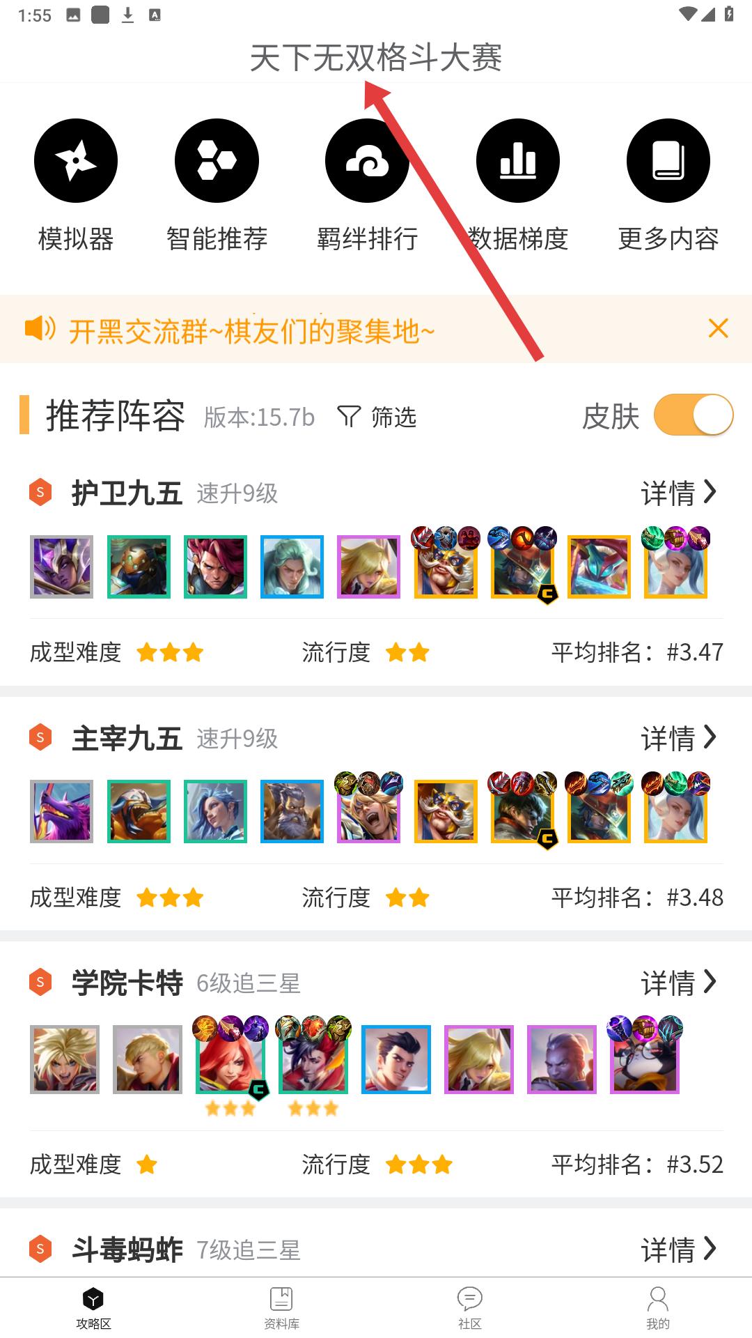 2、主界面可查看推薦陣容,如護衛九五、主宰九五等,了解陣容的成型難度、流行度和平均排名,為格斗大賽做陣容準備。