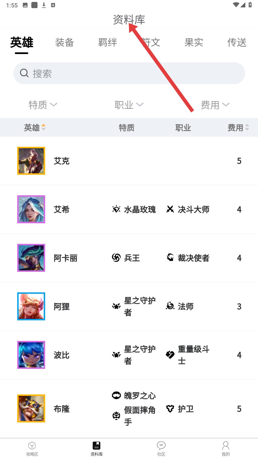 3、點開下方資料庫界面,在資料庫則能用看到全部的英雄、裝備、羈絆等內容。