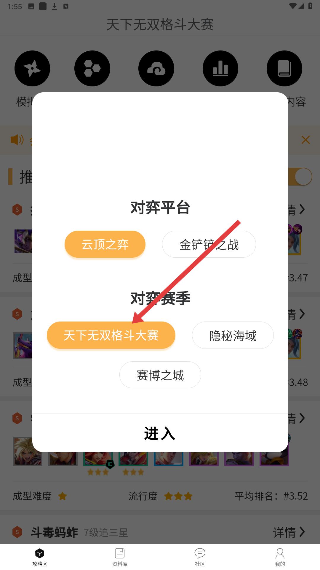 1、進入游戲可選擇對弈平臺和賽季,如選擇云頂之弈平臺、天下無雙格斗大賽賽季,點擊進入開啟格斗賽事之旅。