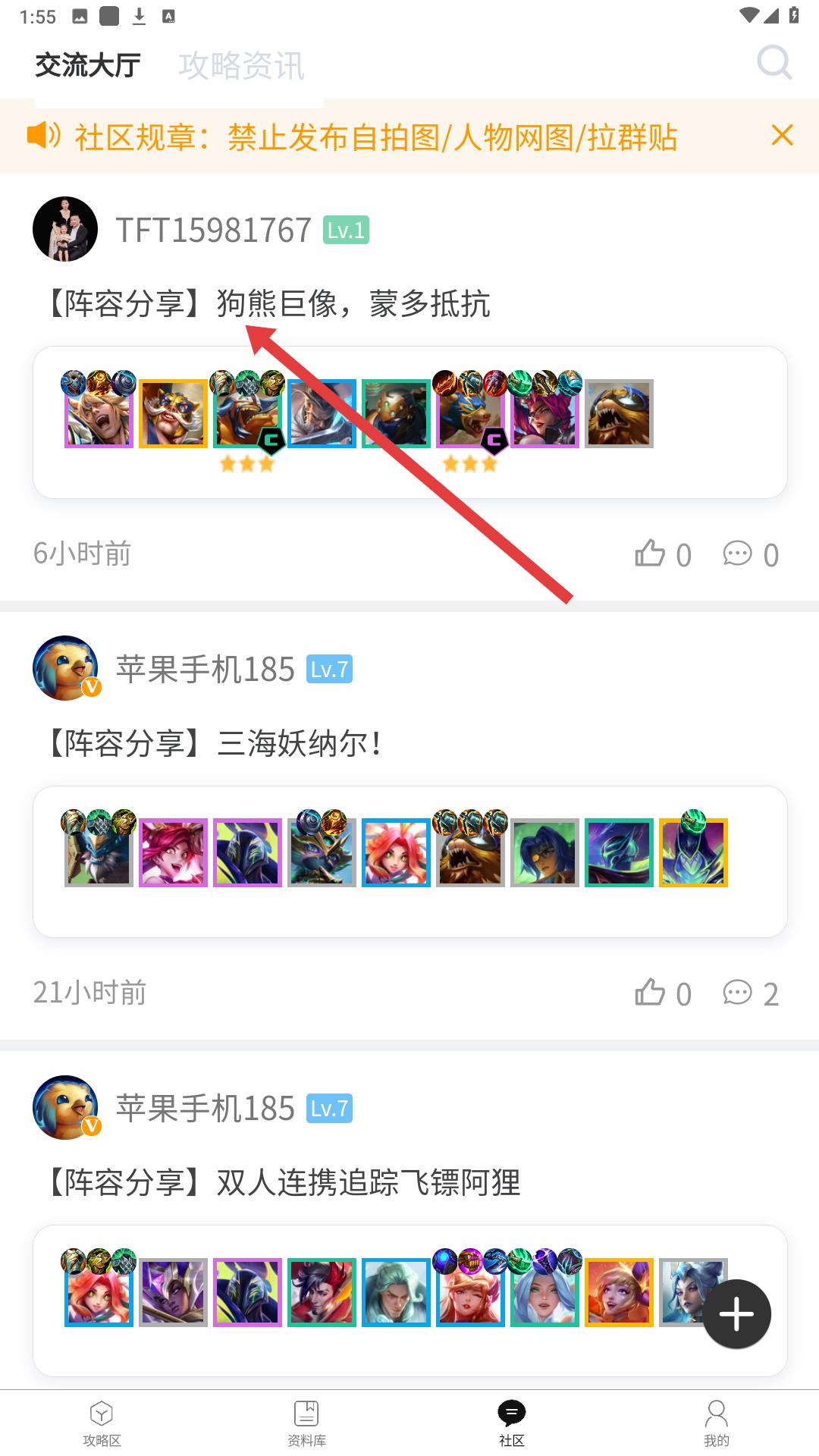 3、社區交流大廳可查看其他玩家分享的陣容,如狗熊巨像蒙多抵抗、三海妖納爾等,借鑒陣容思路提升格斗實力。