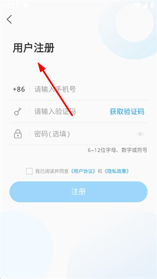 4、點擊快速注冊進入用戶注冊界面,輸入手機號、驗證碼,設置密碼,勾選用戶協議和隱私政策后點擊注冊即可。