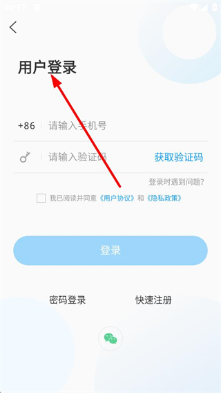 3、用戶登錄界面可輸入手機號、獲取并輸入驗證碼,也可選擇密碼登錄或微信登錄,若需注冊可點擊快速注冊。