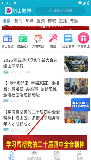 1、進入嶗山融媒應用后,首頁可瀏覽推薦、新聞、熱點等各類資訊,還有嶗山頻道、文明實踐等功能入口。