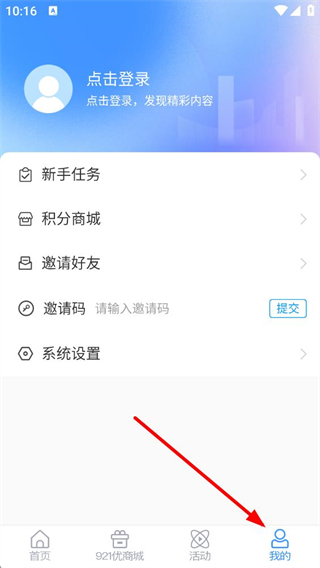 2、點擊底部我的按鈕,進入個人中心界面,可看到新手任務、積分商城等功能,點擊登錄可進入用戶登錄界面。