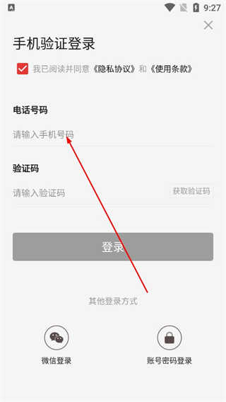1、進入手機驗證登錄頁,勾選已閱讀并同意協議,在電話號碼欄填寫號碼,點擊獲取驗證碼,填入后點擊登錄按鈕完成賬號登錄。