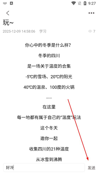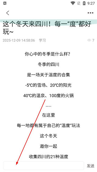 3、在文章詳情頁閱讀關于四川冬季不同溫度玩法的介紹,了解各地的特色體驗,之后找到頁面底部的評論輸入框。