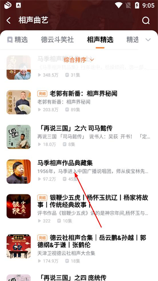 2、在相聲曲藝頁面選擇目標音頻如馬季相聲作品典藏集,點擊進入該音頻的詳情頁面,查看節目列表和播放數據。