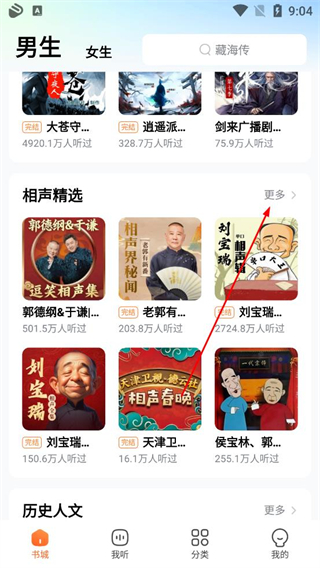 1、進入軟件首頁選擇男生頻道,找到相聲精選板塊點擊更多,進入相聲曲藝分類頁面,瀏覽各類相聲音頻內容。