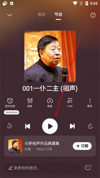 4、在播放界面點擊播放按鈕開始收聽相聲,也能使用定時關閉倍速等功能,還可點擊訂閱按鈕關注該音頻內容。