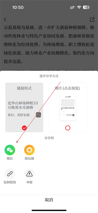 4、在資訊詳情頁點擊分享按鈕選擇鏈接形式或圖片形式的分享方式,再選擇分享到微信或朋友圈,也可復制鏈接保存資訊。