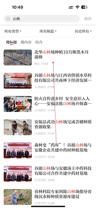 2、返回首頁在搜索框輸入關鍵詞選擇類型頻道等篩選條件,瀏覽搜索結果中的資訊內容,從中挑選感興趣的資訊進行查看。