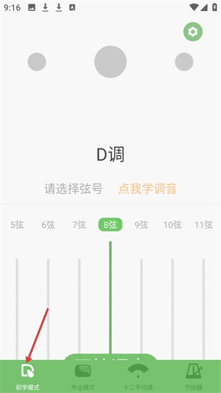 1、初學模式,適用于樂器初學者,顯示D調,可選弦號,有點我學調音提示,幫助初學者學樂器調音,操作簡單。