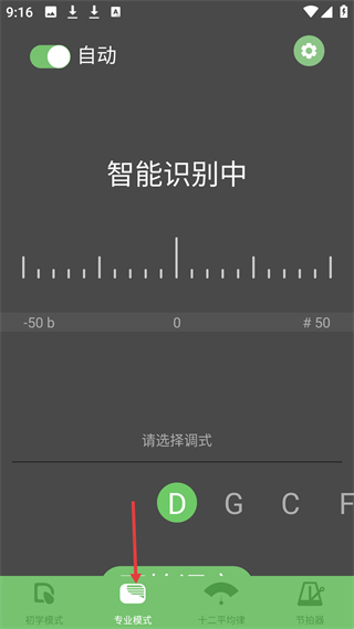 2、專業模式,具備自動智能識別功能,可選擇調式,能精準識別樂器音高,滿足專業人士精準調音需求。