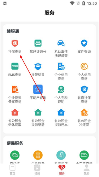 1、打開軟件進入服務頁面,瀏覽解服通板塊的社保查詢駕駛證記分等服務,選擇社保查詢選項,需要先登錄。
