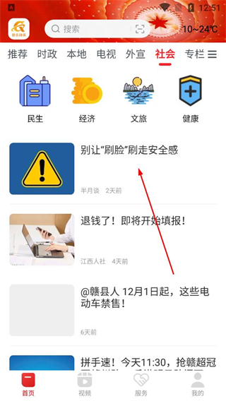 4、在社會頻道頁面瀏覽民生經濟等分類下的資訊,選擇別讓刷臉刷走安全感等文章,進入詳情頁查看具體內容。
