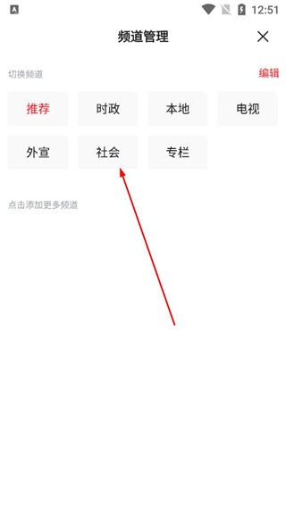 3、進入頻道管理頁面切換至社會頻道,可選擇添加更多頻道,自定義資訊的展示分類,便于查看感興趣的內容。