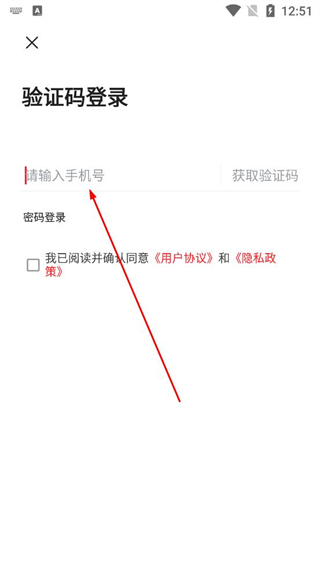 2、在驗證登錄頁面,選擇驗證碼登錄方式,輸入手機號碼并獲取驗證碼,勾選用戶協議和隱私政策后完成登錄。