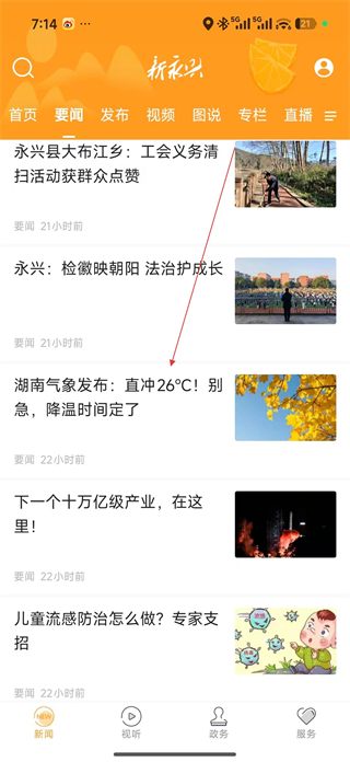 2、登錄后進入首頁瀏覽要聞發布等分類內容,查看湖南氣象發布的資訊選擇該資訊。
