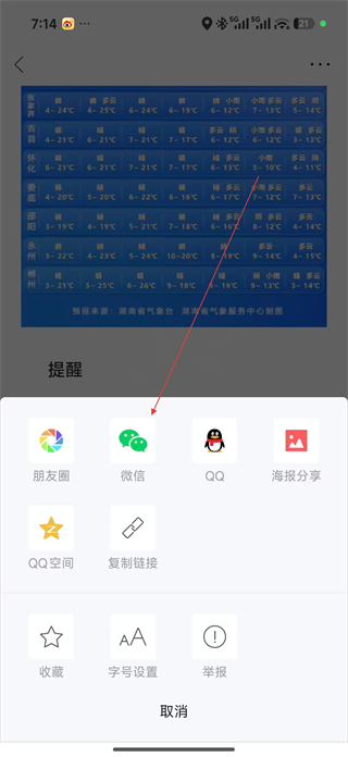 4、在詳情頁面點擊更多按鈕,選擇朋友圈微信等分享渠道,將天氣資訊分享給其他用戶。