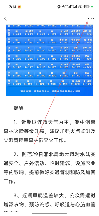 3、進入資訊詳情頁面查看天氣表格及提醒內容,了解近期天氣情況及相關防范建議,點擊上方的三個點分享按鈕。