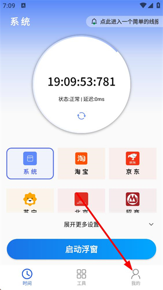 1、進入工具主界面,顯示系統時間及狀態延遲信息,有系統淘寶等平臺選項,可點擊展開更多設置,還能啟動浮窗,底部設時間工具我的等功能選項。