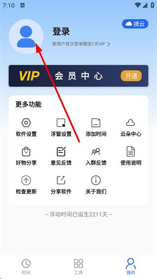 2、進入我的頁面,可進行登錄操作,新用戶首次登錄贈1天VIP,有VIP會員中心入口,還有軟件設置浮窗設置等更多功能,顯示浮動時間已誕生的時長。