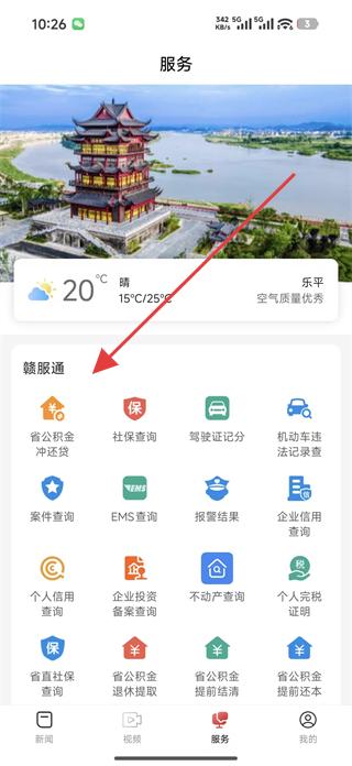 1、進入軟件服務頁面查看贛服通板塊的省公積金沖還貸、社保查詢等服務入口,了解各類政務服務功能,方便業務辦理。