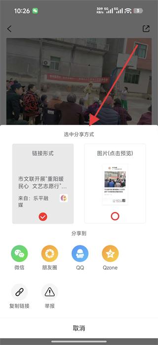4、在分享頁面選擇鏈接形式或圖片形式,挑選微信、朋友圈等分享渠道,將資訊分享給他人,擴大信息傳播,同時可進行舉報等操作管理資訊內容。