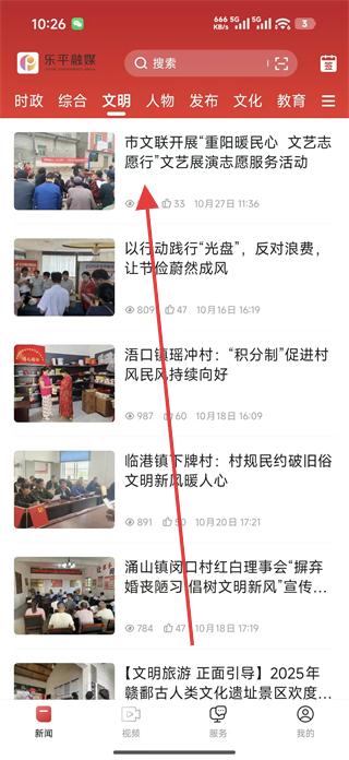 2、進入樂平融媒頁面瀏覽文明板塊的市文聯開展重陽暖民心文藝志愿行等資訊,了解地方文化活動與文明建設動態,豐富資訊獲取。
