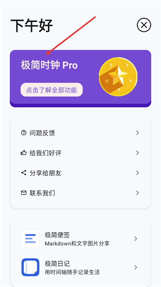 1、該頁面是極簡時鐘Pro功能入口,可查看Pro版專屬功能介紹,完成問題反饋、軟件分享,關聯極簡便簽、日記等工具,豐富使用場景。