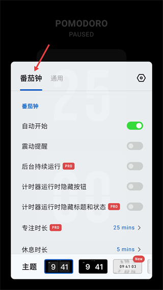 3、番茄鐘設置頁可配置自動開始、專注與休息時長,Pro版解鎖更多設置,能切換主題樣式,助力通過番茄工作法提升專注效率。