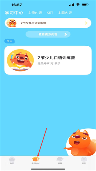 1、學習中心界面核心是7節少兒口語訓練營,北美外教1對1教學,引導孩子開口,助力提升口語,界面清晰、操作便捷。