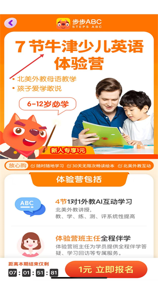 1、推出7節口語體驗營,主打北美外教母語教學,適配孩子新人專享1元,含隨時隨地學習、30天暢讀繪本及外教互動,倒計時促報名,助力愛學敢說。