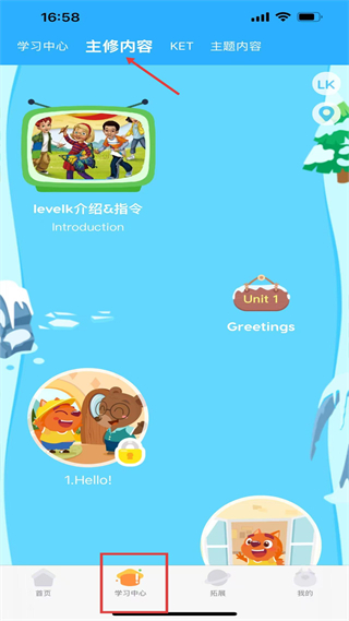 2、學習中心的主修內容板塊,有levelk介紹和指令、Unit1Greetings等課程,借動畫場景呈現,按階段引導少兒系統學英語,逐步筑牢語言基礎。