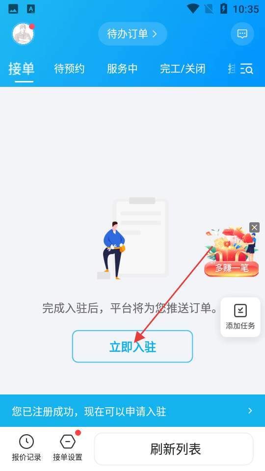 1、打開應用在注冊成功后的頁面,能看到立即入駐按鈕,點擊它就開啟入駐之旅,這是從注冊到成為平臺服務者的關鍵一步,后續需完善各類信息,讓平臺了解你的服務能力。