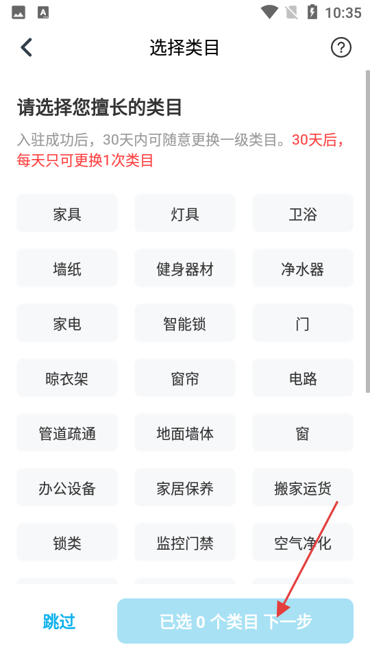 2、進入選擇類目頁面,有家具、燈具等眾多服務類目,根據自身技能選擅長的,入駐后30天內可隨意換一級類目,選好或跳過選類目點擊下一步,確定服務方向匹配訂單需求。