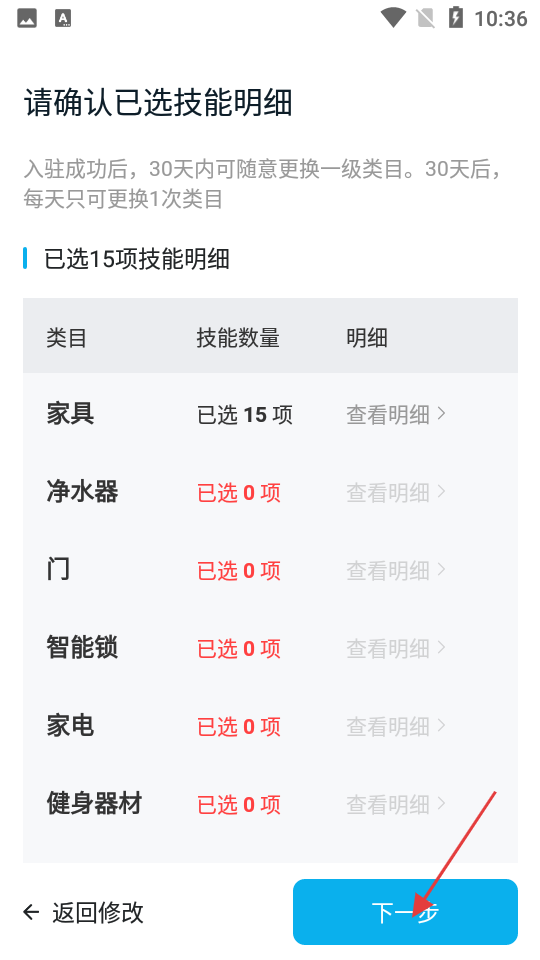 3、來到確認已選技能明細頁,展示所選類目及技能數量,可查看各分類下已選、未選情況,若有調整點返回修改,確認無誤點下一步,確保平臺精準推送對應訂單。